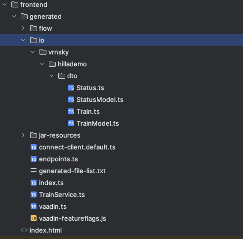 Inside the frontend/generated folder, you may see interfaces generated from your data transfer objects and services from the service definition.